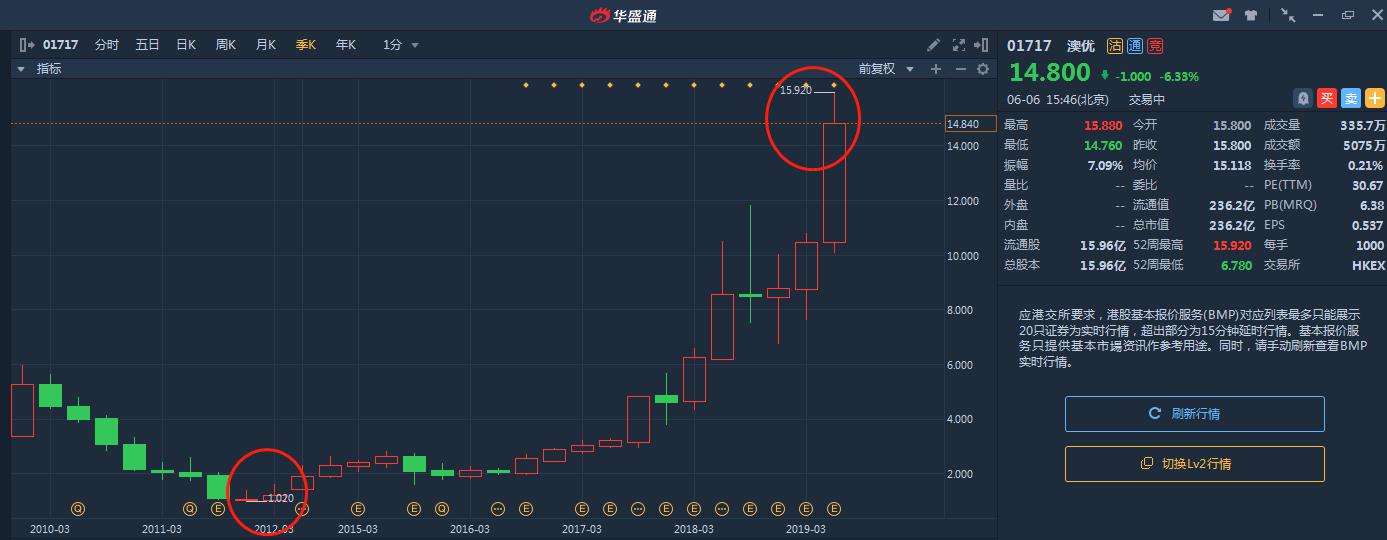 澳优乳业成立于2003年9月,于2009年10月在港交所上市。公司主要从事生产、营销婴幼儿奶粉产品,奶源全部来自海外乳业大国(荷兰、新西兰、澳洲)。从2011年到2012年,澳优的股价长期在1港元到1.6港元的区间,而最新截止到2019年6月6日收盘,澳优一度刷新最高价15.9港元。不到8年时间,这只奶粉股区间涨幅超过10倍!
