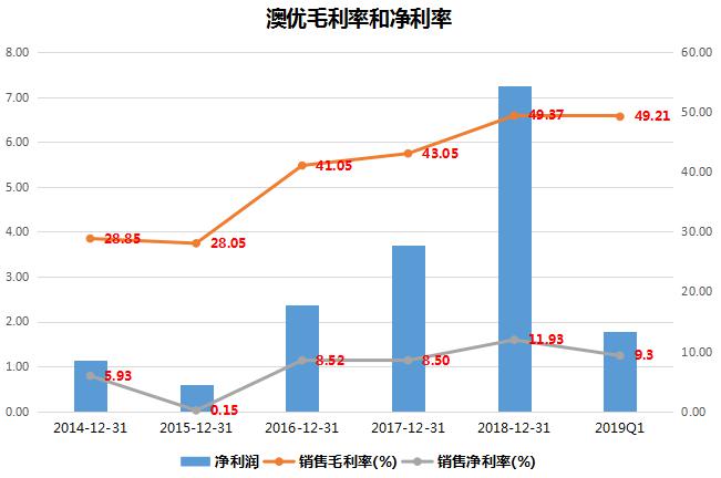与此同时,伴随着澳优营收的大幅增长,其毛利率却呈现了持续上升的趋势,证明公司的盈利能力也在大幅提升。像2014年至2015年,澳优毛利率仅为28%的水平,到了2016至2018年则大幅提升到了40%以上,18年和2019Q1都保持在了49%的历史最高水平。