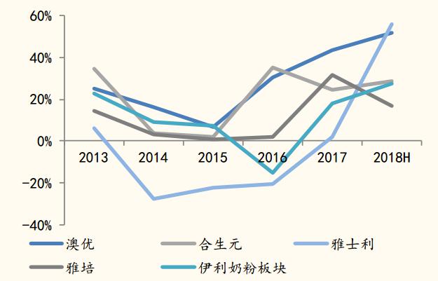 澳优的业绩数据有多好,我们横向比较一下行业内的公司。下图是与其他奶粉公司营收增速的比较,澳优处于完全领先的水平,而且是在2015年至今的连续4年。观察其对手如合生元、雅培以及伊利,这些家喻户晓的奶粉公司,其实品牌力和公司实力并不弱。