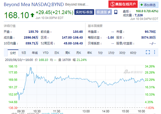 这家另类肉类公司的股价自25美元每股的首次公开发行以来上涨了600%以上,在周一的交易中达到了每股186.43美元的高点。此后该指数已从这一水平回升,最后收于168.1美元,当天仍上涨了21.24%。