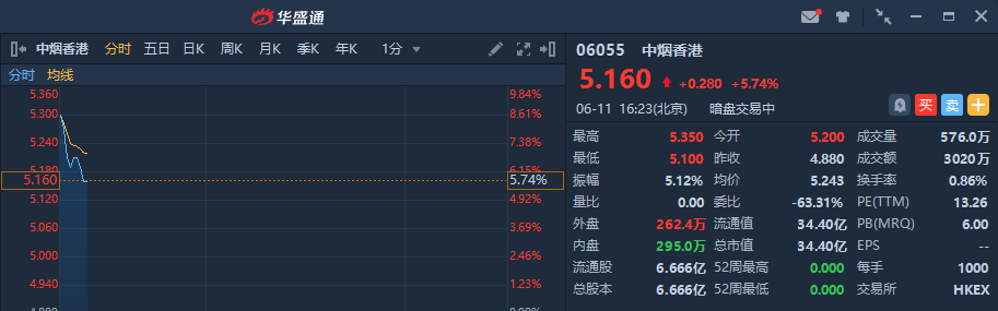 中烟香港暗盘开盘一度大涨超9%,最高报价5.35港元。截止16时23分,现报5.16港元,较发行价4.88港元涨5.74%,每手可赚280港元,成交额达到3020万港元,总市值达34.4亿港元。