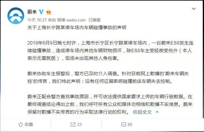 6月10日下午,蔚来官方微博对此事作出回应称:没有任何证据表明碰撞前该车辆失去控制,目前正对事故原因展开调查。