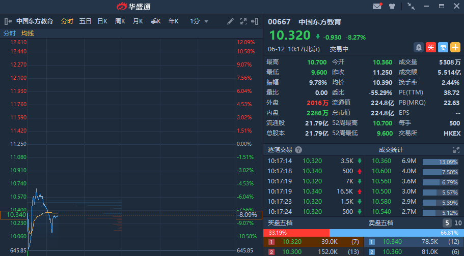中国东方教育今日挂牌上市,股价低开7.91%,报价10.36港元。截止10时17分,中国东方教育股价跌8.27%,报价10.32港元,成交额5.514亿港元。