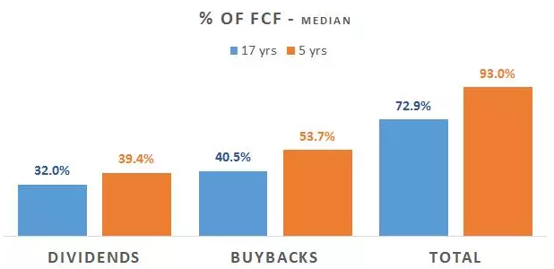 这张表显示,在过去的17年里,93%的自由现金流都花在了股东价值上(股息和回购)。