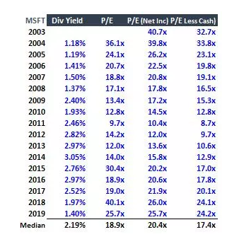 所以MSFT现在是一家市值上万亿美元的公司。在过去的15年里,它的股票数量减少了30%,在过去的10年里,它已经支付了每股11.76美元的股息。在此过程中,微软金融服务公司的现金余额也有所增长。这一点很重要,因为过去15年的净市盈率(扣除净现金余额后,也就是扣除债务后)一直没有名义市盈率那么高。见下表: