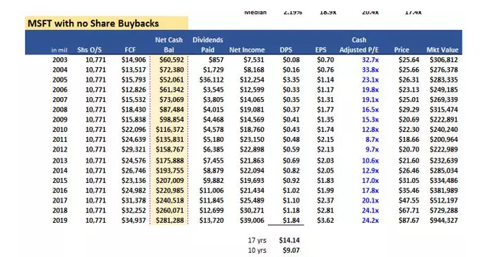 不包括股票回购的计算。利用上面的信息,我们可以估计没有股票回购会发生什么。一个主要的假设是,股票数量与2003年首次发放股息时持平。当时的股份总数超过107亿股(今天是76亿股)。接下来,我们假设现金增加,然后向股东支付特别股息。换句话说,我们保持股息支付不变,让现金积累。有两个原因。首先,公司倾向于按净利润总额的百分比支付股息。这使得股息保持稳定。其次,它允许现金积累。如果没有回购,它既可以用于大规模收购,比如微软在2016年以260亿美元现金收购领英,也可以用于特别股息,比如2003年支付的股息。