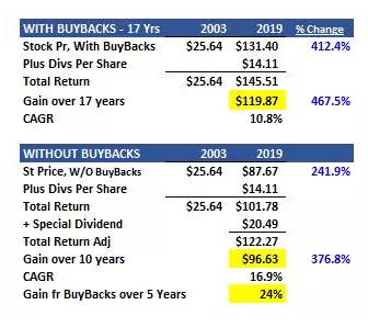 这表明,在过去的10年里,有回购的总回报率比没有回购的高27%。请注意,这种比较甚至包括为无回购计算而支付的20.49美元特别股息。实际上,在过去10年里,微软金融服务公司的总回报率为每股121.52美元,折合成年率为20.8%。没有回购,但包括所有额外现金的特别股息,只能返还95.60美元。差额为27%。这意味着,每花在回购上的1美元,就有1.27美元返还给股东。