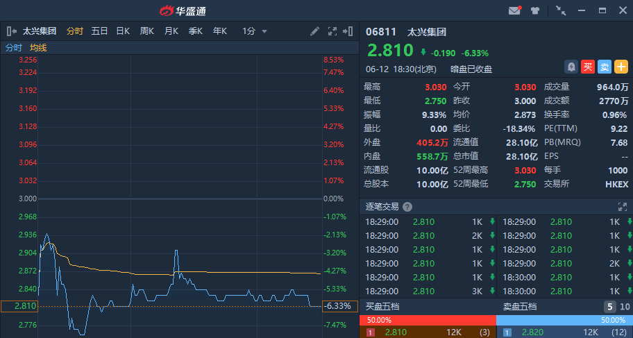 太兴集团今日暗盘收报2.81港元,较发行价3.0港元跌6.33%,每手蚀190港元,成交额2770万港元,总市值为28.1亿港元。
