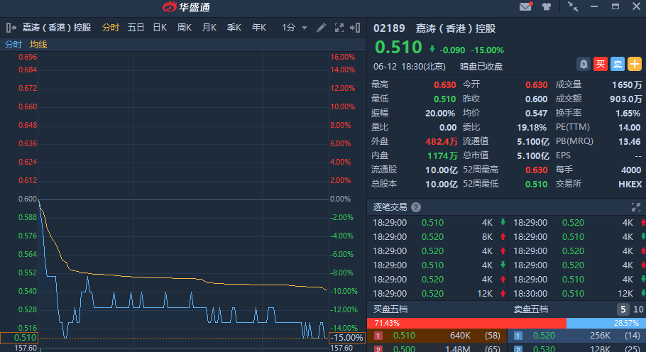 嘉涛(香港)控股今日暗盘收报0.51港元,较发行价0.6港元跌15.0%,每手蚀360港元,成交额903万港元,总市值为5.1亿港元。