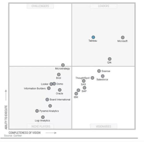 因为在过去的两年里,微软一直是商业智能领域的市场领导者。 Tableau 是市场领导者,但最近落后于微软。 根据 Gartner 的研究,Tableau 已经落后了,这使得 Salesforce 的收购对于一家努力保持市场领先地位的公司来说是一种挽回。