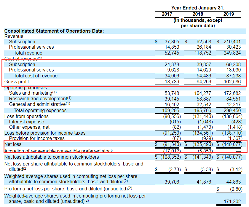 2019财年,CrowdStrike的总收入约为2.50亿美元,同比增长约110%,但强大的收入增速未能超过收入成本和营业费用增速,净亏损仍不断扩大。至于毛利率,2018财年毛利率为54.11%,2019财年毛利率为65%。未来,投资者要关注其新项目的发展情况,留意其盈利时间节点。其他关键指标如客户订阅数量在2019财年达2516,同比增长了103%。