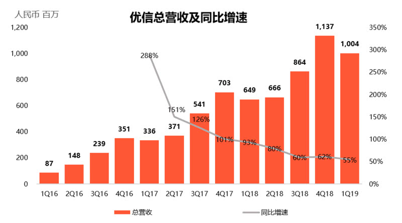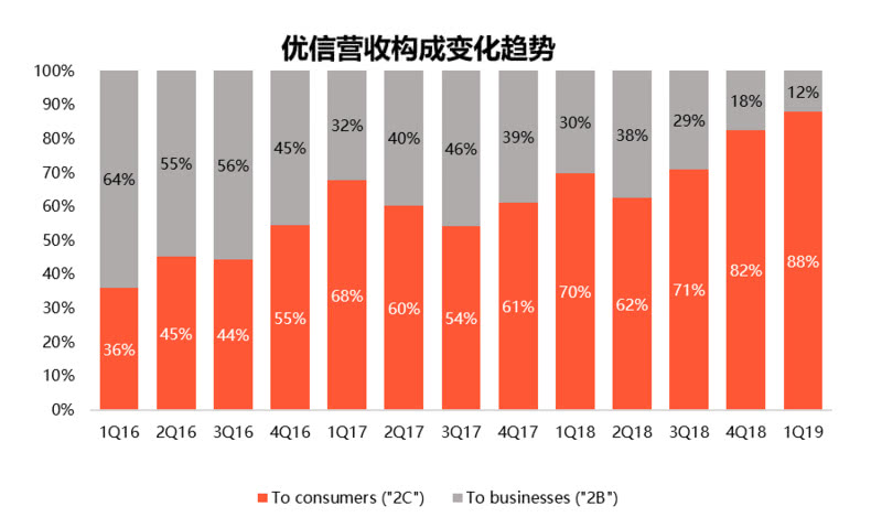 财报显示,2019年第一季度,优信整体营收10.4亿元,同比增长54.6%。其中,2C业务营收达到8.83亿元,同比增长94.4%,表现尤为强劲,延续此前的一贯走势,2C业务占总营收的比例进一步扩大,由上季度的82%继续扩张至88%。