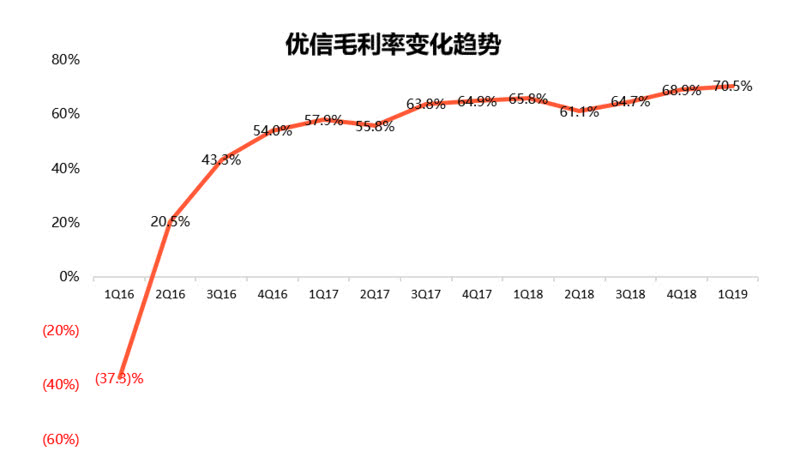 财报显示,优信2019年一季度毛利润为7.1亿元人民币,同比增长65.6%。与去年同期的65.8%相比,本季度毛利率上升至70.5%,创历年最高水平。毛利润的增长和毛利率的提高主要受益于平均佣金率的提高。