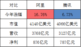 目前腾讯是毫无疑问的港股股王。但是,如果阿里赴港上市,届时谁是港股一哥将充满未知数。截至2019年6月13日港股收盘,腾讯控股市值4066亿美元,阿里市值为4140亿美元;今年以来,阿里涨16.76%,腾讯涨6.73%;营收方面:阿里和腾讯最新年度营收分别为3768.44亿元、3126.94亿元;净利方面:阿里和腾讯最新年度净利分别为876亿和787亿元。