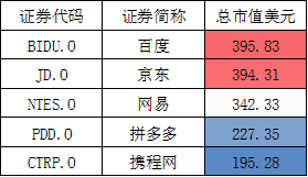 目前,除了阿里之外的在美股上市的5大互联网科技公司,其中,百度市值396亿美元、京东394亿美元、网易342亿美元、拼多多227亿美元、携程网195亿美元。