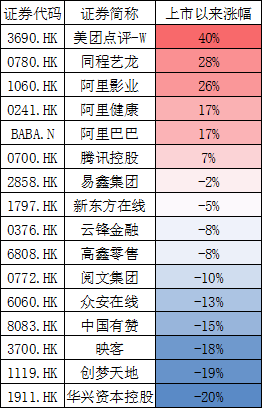虽然在港股上市的公司腾讯更占一筹,但在股价表现上,今年以来阿里系股价则表现更好。像华兴资本、创梦天地、映客等跌近20%,阅文、众安在线跌10%。如果从单只股票来说,今年以来美团累涨40%,是统计里面表现最好的股票。