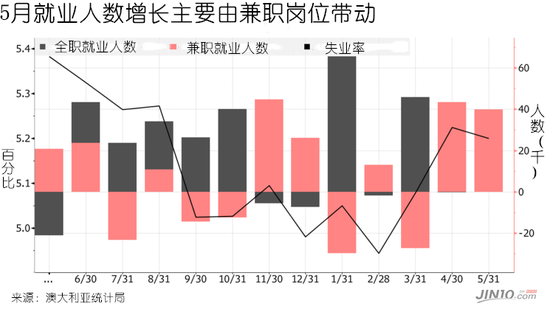 澳大利亚统计局周四公布的数据显示,5月份就业人数增加42300人,远远大于预期的16000人。但失业率仍稳定在5.2%,远高于澳洲联储估计需要恢复价格压力的4.5%水平。