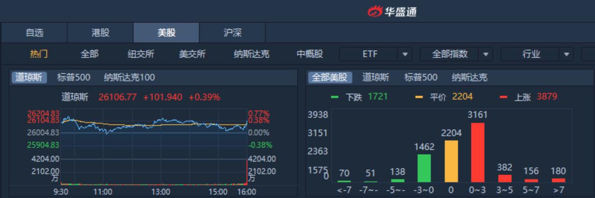 周四,美股三大指数均小幅上涨,道指报26106点,涨101点,涨幅0.39%;标普500报2891点,涨11点,涨幅0.41%;纳指报7837点,涨44点,涨幅0.57%。