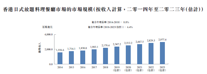 日式放题料理餐厅因能够让顾客于用餐期间根据个人偏好品尝种类更丰富的美食及不受限制的续饮,成为最受欢迎的日式餐厅类型。2014-2018年,日式放题料理餐厅市场的收入按约8.8%的复合年增长率,由1556.6百万港元增加至2179.4百万港元,预期将以6.4%的复合年增长率增至2023年的2977.4百万港元,增速高于同期香港餐饮的整体增速3.3%。