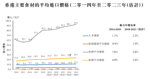 扎根于香港这一严重依赖进口的地区,食品及饮料需从中国大陆、日本等地进口,因此其食材成本深受价格影响。大喜屋运营涉及到的主要食材为海鲜、肉类、蔬菜、甜点及蔬菜,其中主要食材中海鲜均价最高,价格复合年增长率远高于大米、新鲜蔬菜,预计未来几年增长率仍有较高增长。