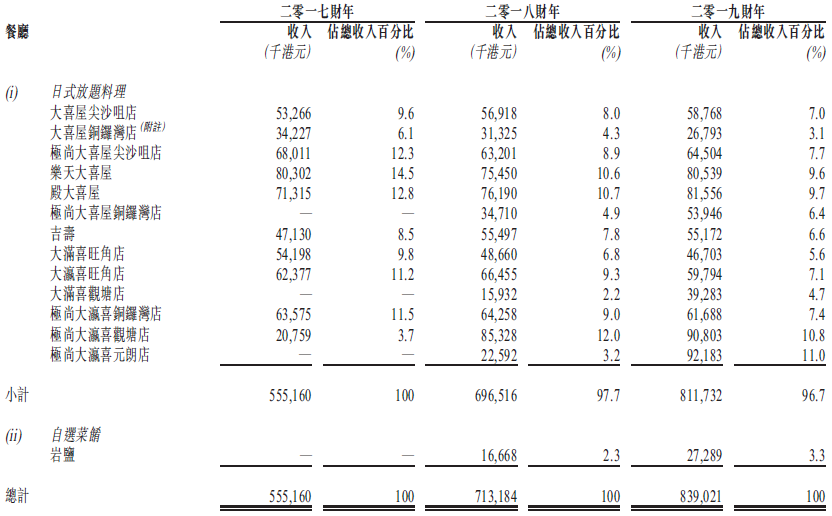大喜屋曾获大众点评评为“2017年度人气商户”。根据灼识资讯,2018年按收入计算,大喜屋在香港日式放题料理餐厅市场排名第一,占有37.1%市场份额。截至今年3月底止的2019年财年,大喜屋收入达8.39亿港元,同比增17.6%,净利润飙升1.47倍至9220.8万港元,13个店面平均每店每年盈利709万港元。