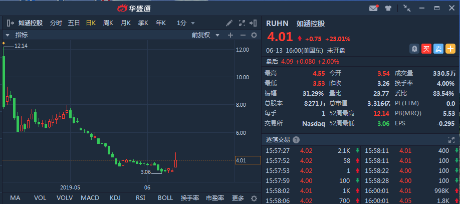 6月13日美股盘前,如涵控股发布了最新财报,第一季度净亏损0.29亿元,同比收窄53.3%。财报发布后,股价大涨23%。