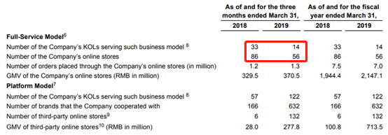 前面提到公司在第四财季的主要收入增长来自于服务收入,主要是由于公司正在将部分网点从自营模式向平台模式转变。2019财年,公司自营网店数量从去年同期的86个减少到56个,自营模式下的网红数量从去年同期的33个减少到14个。