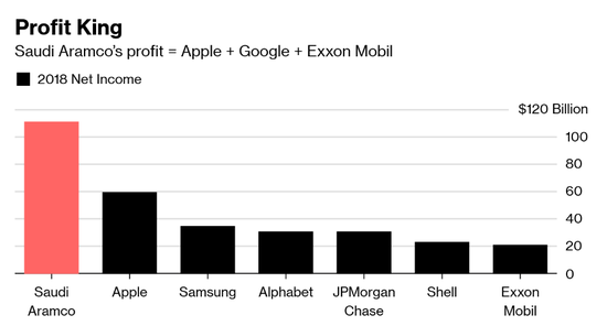今年4月,沙特阿美的财务业绩首次得到官方公布,证实这家国有石油巨头是2018年全球最赚钱的公司:去年的净利润为1111亿美元,相当于苹果、谷歌和埃克森美孚等美国巨头的总和。
