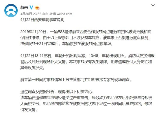 4月22日,西安蔚来授权服务中心一辆正在维修的ES8发生燃烧。4月30日晚,蔚来汽车通过官方微博发布事故说明,称该车在送修前底盘曾遭受过严重撞击,导致动力电池包左后部外壳与冷却板大面积变形。电池包内部结构在被挤压的状态下经过一段时间后形成短路,最终引发火情。