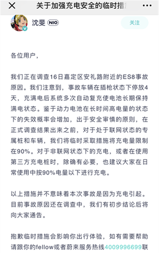 5月17日晚间,蔚来汽车能源副总裁沈斐在蔚来APP上发布《关于加强充电安全的临时措施》称,鉴于动力电池在长时间高电量状态下的失效概率会增加,出于安全审慎的原则,在正式调查结果出来之前,对于处于联网状态的专属桩和车辆,蔚来将临时采取措施将充电量限制在90%。然而,此举也引来不少蔚来ES8用户在APP端表达不满。