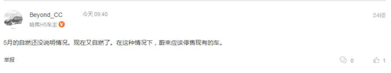 对于蔚来的频频起火,在某汽车论坛上有网友表示,“5月的自燃还没说明情况,现在又自燃了。在这种情况下,蔚来应该停售现有的车。”