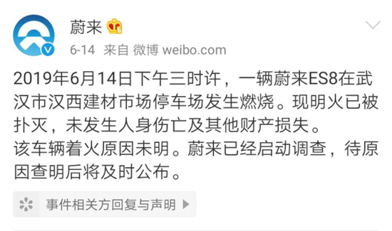 经济日报-中国经济网6月17日讯 6月14日下午三时许,一辆蔚来ES8在湖北武汉汉西建材市场停车场发生燃烧。随后,蔚来汽车在其官方微博对此予以确认,并称事故未发生人身伤亡及其他财产损失,已经启动起火原因调查。