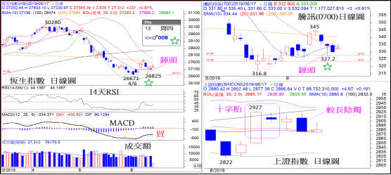 A股方面,上證指數早前以「十字胎」的轉向形態在2927見頂之後,上周五亦出現一支較長的陰燭,結果構成一個見頂的組合。短線支持區由10天平均線及20天保力加通道中軸線所組成,介乎於2880至2885之間,一旦失守,其後將下試位於2833的下限線。