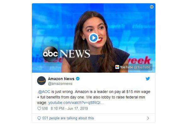 亚马逊的官方推特对寇蒂兹这一言论作出了回应,称“亚马逊在工资方面是领先的,支付15美元最低工资和全额福利。我们还在游说提高联邦最低工资。”
