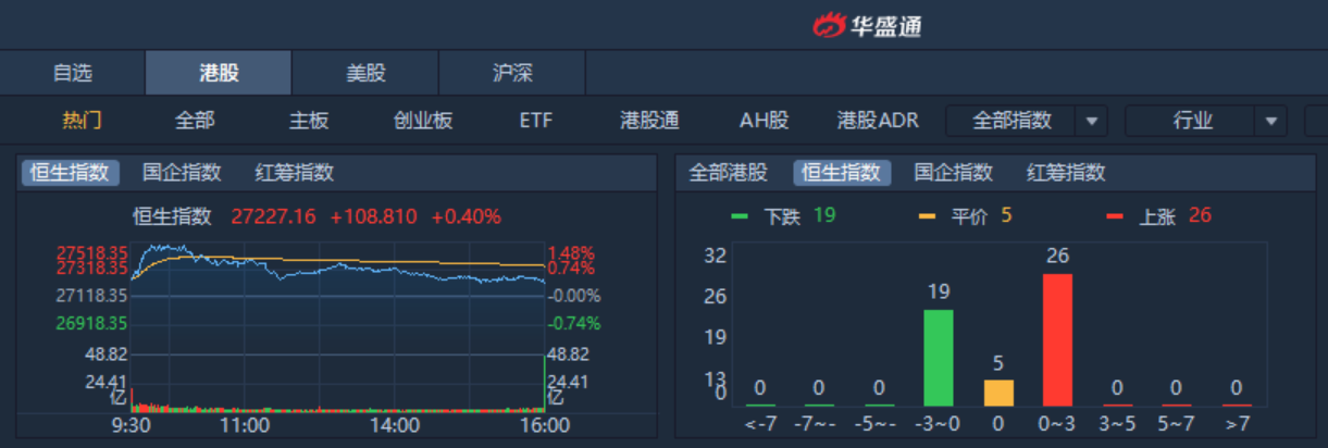 周一,恒指早盘高开,盘初直线走高,后逐步回落,日内再度失守5日线、20日线,量能创6月以来新低。截至收盘,恒生指数涨0.4%,报27227.16点,全日成交额达669.02亿。国企指数涨0.08%,报10428.52点,红筹指数跌0.32%,报4282.1点。