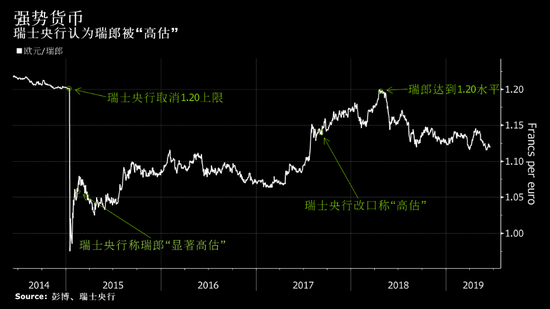 自金融危机爆发以来,身为避险货币的瑞郎已大幅升值,抑制了经济增长和通货膨胀。瑞士央行认为瑞郎“被高估”。它使用的-0.75%的存款利率和干预市场的承诺来遏制瑞郎升值。