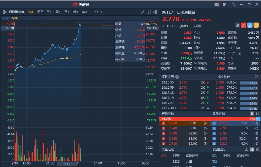 6月19日消息,中国最大的粮食及木片进口港日照港裕廊今日首日上市,午后涨幅扩大至84.67%,报2.77港元,暂成交4843万港元,最新总市值44.32亿港元。