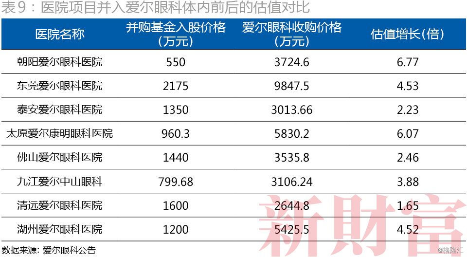 以滨州沪滨爱尔眼科医院为例,2015年12月,湖南爱尔中钰投资获得滨州沪滨爱尔眼科医院70%股权时,出资额为1750万元,而在不到一年后的2016年7月31日,爱尔眼科以2.09亿元的价格,将滨州沪滨爱尔眼科医院纳入上市公司体内。仅仅几个月,滨州沪滨爱尔眼科医院的估值就暴涨12倍,合伙人赚到盆满钵满。