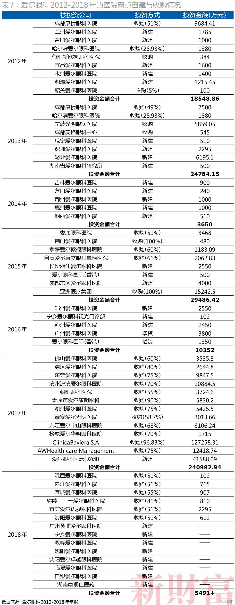 2014年开始,在产业并购基金的推动下,爱尔眼科收购的脚步加快,其体内体外同时运作,重大医院投资中,自建的数量在减少。但到了2018年,爱尔眼科不仅收购在继续,又重新开始了自建医院以及门诊部(表7),强化“广覆盖、深密度”的网络布局。