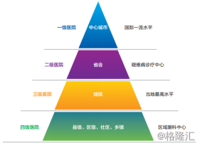 爱尔眼科在二三线城市势如破竹,关键在于其实施的分级连锁模式。据介绍,分级连锁模式主要是根据医疗消费水平及人口集中度,将医院划分为“中心城市—省会—地级市—县级”四个层级(图4)。分级连锁的最上方,是以上海爱尔疑难病眼科中心为核心的一级医院,之后递级下沉。