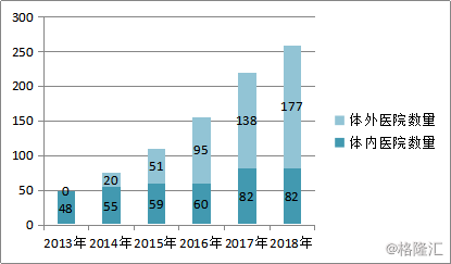 截至2018年7月,爱尔眼科上市公司控股眼科医院(体内医院)82家,另外有参股产业基金控股眼科医院(体外医院)177家,从2014年设立并购基金以来,爱尔眼科的医院总数翻了近3.5倍,体内医院数量增长了70%,为医院数量增长贡献非常突出的还是体外医院。自2014年并购基金设立起,短短5年,其数量就从20家增长至177家(图8),爱尔眼科的品牌也逐渐覆盖到一些较小的城市甚至是县城。