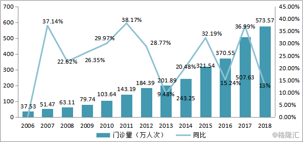 图6:爱尔眼科2006-2018年门诊量数据的变化情况