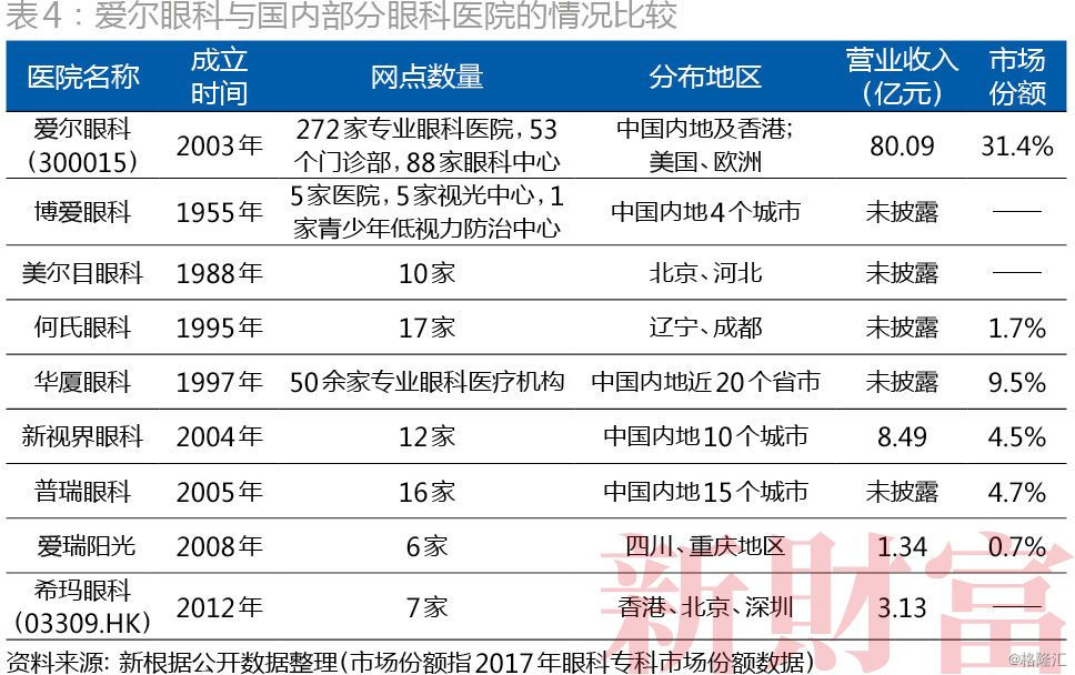 事实上,国内的民营眼科行业发展由来已久。华厦眼科、何氏眼科、美尔目眼科和博爱眼科都成立于上个世纪,最长的甚至有64年的历史,从成立时间来看,爱尔眼科并非“资历最老”的民营眼科医院。但是时至今日,前述老牌民营眼科医院,无论网点数量,还是经营业绩,相较于后来居上的爱尔眼科差距悬殊,早被甩出了几条街远。