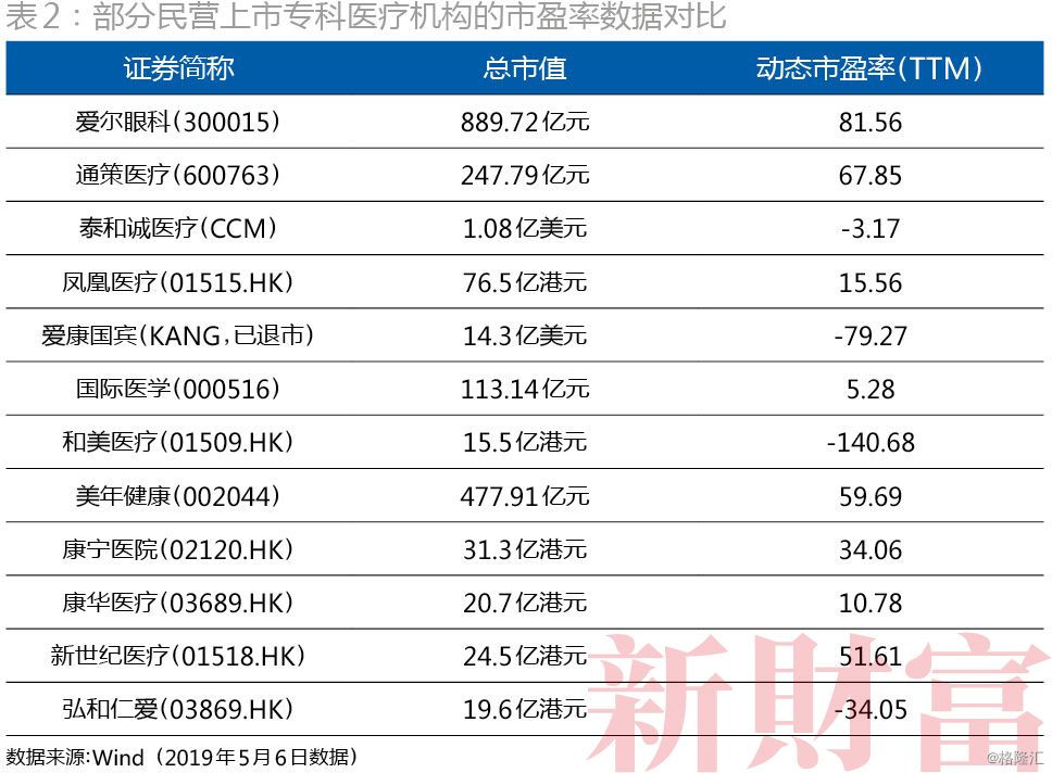 与国内同样类型的民营专科医院相比,爱尔眼科的市盈率仍然独占鳌头。表2可见,在众多A股、港股、美股上市的民营医院中,爱尔眼科超过80倍的市盈率,仅通策医疗(600763)与之接近。显而易见,资本市场给予了爱尔眼科高于同行的估值。