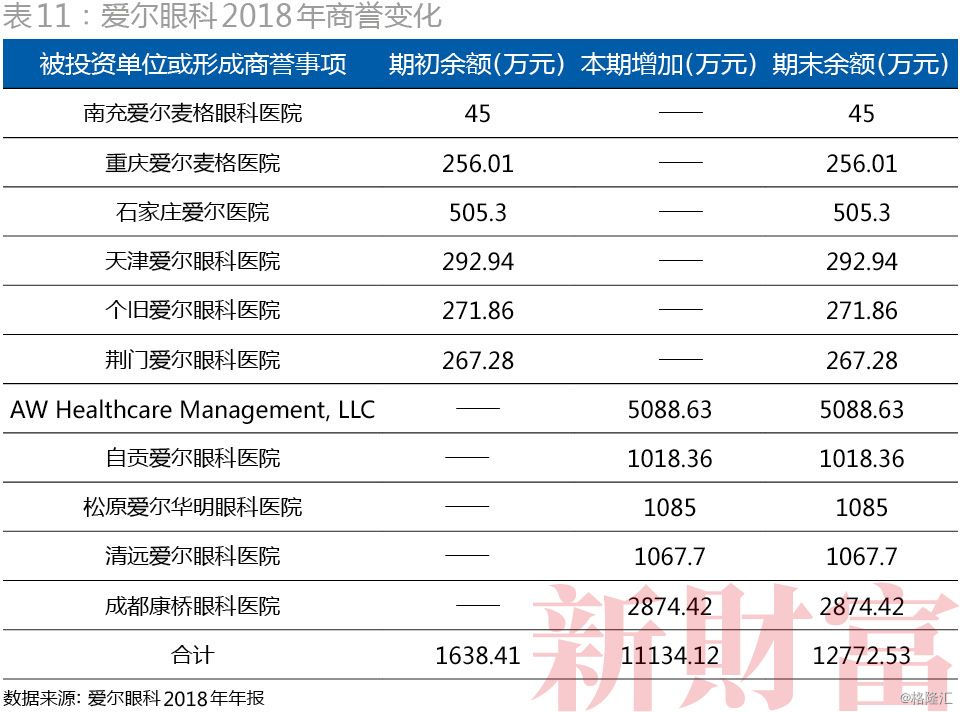 2017年,爱尔眼科的商誉减值准备共为1638.41万元,计提减值准备的地方眼科医院共7家,新增个旧和荆门2家医院,其中,成都麦格眼科医院在2017年5月5日完成工商注销,当年商誉减值损失为539.14万元。2018年,爱尔眼科的商誉减值准备持续增加至1.28亿元(表11)。相比2017年,爱尔眼科2018年的减值准备计提单个公司的数额大幅增加。新收购医院未来是否会进一步发生更多减值,并不可知。