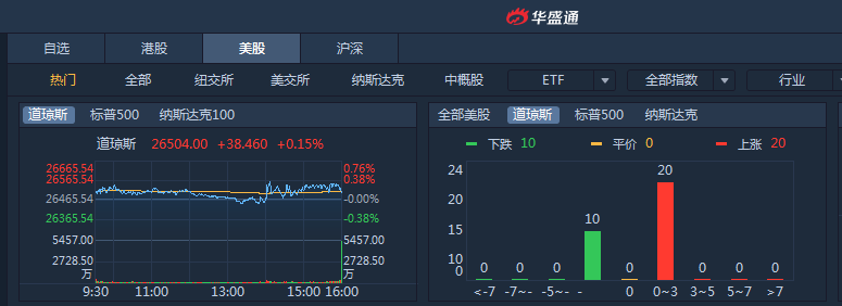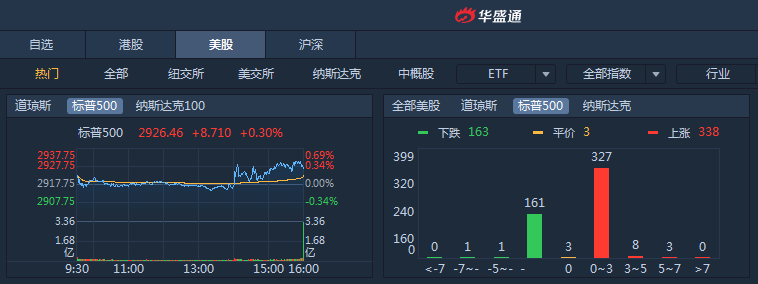 受美联储政策会议的影响,周三美股小幅收涨,实现三连阳。道指涨0.15%,报26504点;标普500涨0.3%,报2926.46点;纳指涨0.42%,报7987.32点。