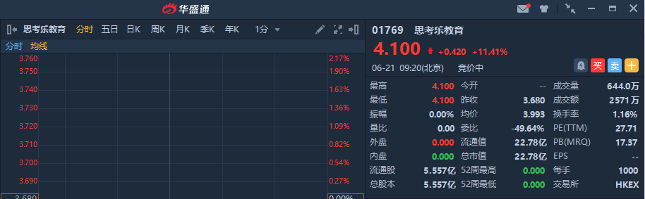 智通财经APP获悉,思考乐教育(01769)首日挂牌,截至9时20分,涨11.41%,报价4.1港元,成交额2571万港元。