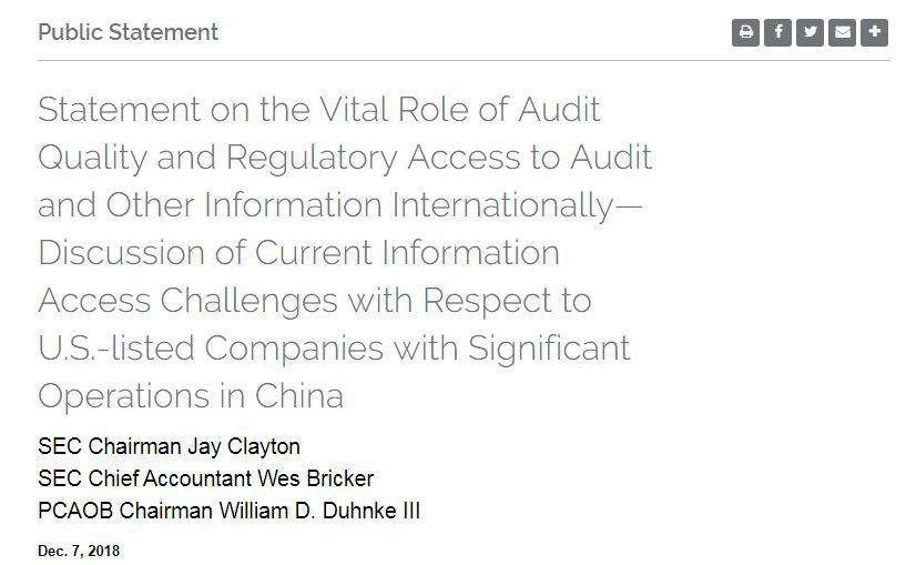 去年12月7日,SEC和PCAOB(美国公众公司会计监管委员会)发布联合声明——《关于审计质量和监管获取审计和其他国际信息的重要作用声明——关于在中国有大量业务的美国上市公司当前信息获取的挑战讨论》。该声明称:如果重大的信息障碍持续存在,对美国上市公司采取补救措施可能是必要或适当的。过去的补救措施例如:施以更严格的信披要求,以及施加更多的新证券发行限制。