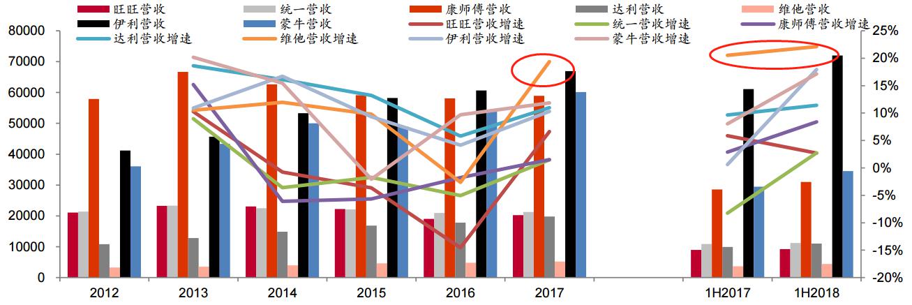 第二维他奶国际不仅稳,还从17年到18年呈现加速增长的势头,这与其他食品饮料公司营收增速下滑的趋势形成鲜明对比。