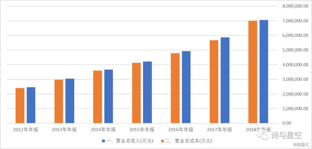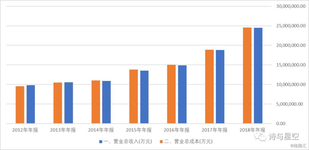 举个例子,A股的永辉超市,每年的营业总收入(蓝色)都大于营业总成本(橙色)。
